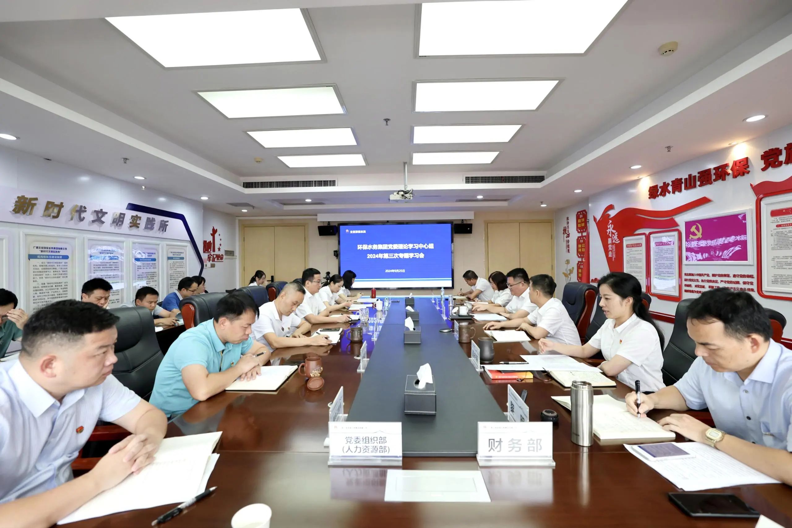 9月25日上午,環(huán)保水務(wù)集團(tuán)黨委舉行理論學(xué)習(xí)中心組2024年第三次專題學(xué)習(xí)會,認(rèn)真學(xué)習(xí)貫徹黨的二十屆三中全會精神,深入貫徹落實(shí)習(xí)近平總書記關(guān)于廣西工作論述的重要要求,著力做好當(dāng)前生產(chǎn)經(jīng)營工作,確保高質(zhì)量完成年度目標(biāo)任務(wù)。環(huán)保水務(wù)集團(tuán)黨委書記、董事長王長兵主持會議并作總結(jié)講話。環(huán)保水務(wù)集團(tuán)全體領(lǐng)導(dǎo)班子出席會議。 會議現(xiàn)場 會議強(qiáng)調(diào),公司上下要掀起學(xué)習(xí)貫徹黨的二十屆三中全會精神熱潮,領(lǐng)導(dǎo)干部特別是中高層干部要先學(xué)一步、學(xué)深一層,示范帶動各基層黨組織跟進(jìn)學(xué)習(xí)。直屬各單位要通過“三會一課”、主題黨日、專題學(xué)習(xí)、研討交流等形式深入學(xué)習(xí),準(zhǔn)確把握其豐富內(nèi)涵、精髓要義和實(shí)踐要求。以強(qiáng)烈的政治擔(dān)當(dāng)、過硬的紀(jì)律作風(fēng)、務(wù)實(shí)的工作舉措,抓好各項(xiàng)工作落實(shí),真正將學(xué)習(xí)成效轉(zhuǎn)化為推動環(huán)保水務(wù)集團(tuán)高質(zhì)量發(fā)展的強(qiáng)大動力。 會議要求,一是以學(xué)為先提素質(zhì)。要把貫徹落實(shí)全會要求同推進(jìn)“一體化、規(guī)?;?、智慧化”工作思路結(jié)合起來,依托“一區(qū)兩地一園一通道”建設(shè)機(jī)遇,積極推動新的項(xiàng)目落地,推進(jìn)在建項(xiàng)目取得新進(jìn)展,推進(jìn)一批科研創(chuàng)新成果轉(zhuǎn)化。二是以干為要抓落實(shí)。要從思想上把抓落實(shí)當(dāng)做一種責(zé)任,一種義務(wù),在實(shí)際工作中樹立起抓落實(shí)的觀念。對于巡視巡察、審計(jì)未完成整改的,要集中力量、集中資源進(jìn)行整改。領(lǐng)導(dǎo)干部要帶頭下沉一線,積極探索縮短差距、解決問題、迎頭趕上的辦法,為完成年度目標(biāo)任務(wù)提供有力保障。三是以實(shí)為本提質(zhì)效。要聚焦目標(biāo),以挖存量、拓增量為突破口,提速度、趕進(jìn)度、彌補(bǔ)缺口、決勝全年。對于調(diào)研中存在的問題,要壓實(shí)責(zé)任,盡快解決。要大膽“走出去”,多溝通多聯(lián)絡(luò),千方百計(jì)尋找新市場。要以快竣工、快運(yùn)營、快投產(chǎn)達(dá)產(chǎn)為著力點(diǎn),全力突破制約瓶頸,加快建設(shè)進(jìn)程,好好總結(jié)經(jīng)驗(yàn),舉一反三。要全力支持企業(yè)科技創(chuàng)新,大力推進(jìn)智慧水務(wù)建設(shè),加快推廣建設(shè)經(jīng)驗(yàn)。四是以廉為基筑底線。要把“清廉環(huán)水”建設(shè)貫通企業(yè)改革發(fā)展、制度完善、治理升級、提質(zhì)增效工作中,促進(jìn)作風(fēng)轉(zhuǎn)變,堅(jiān)決杜絕等靠要思想,杜絕對上等指示、對下等請示。紀(jì)檢監(jiān)察部門要對四季度各項(xiàng)工作開展全方位、全過程的監(jiān)督,把督查推向縱深。 會上,黨委副書記、董事、工會主席覃麗梅,副總經(jīng)理黎明先后領(lǐng)學(xué)了相關(guān)內(nèi)容;紀(jì)委書記麥冬燕、副總經(jīng)理尹建明、總會計(jì)師尹傳勇分別作重點(diǎn)發(fā)言,其他班子成員深入研讀原文,并結(jié)合工作實(shí)際,分享了學(xué)習(xí)心得和對策思路。 北投資本集團(tuán)黨委工作部(組織人力部、黨委宣傳部)負(fù)責(zé)人到會指導(dǎo)。環(huán)保水務(wù)集團(tuán)本部各部門負(fù)責(zé)人參加會議。