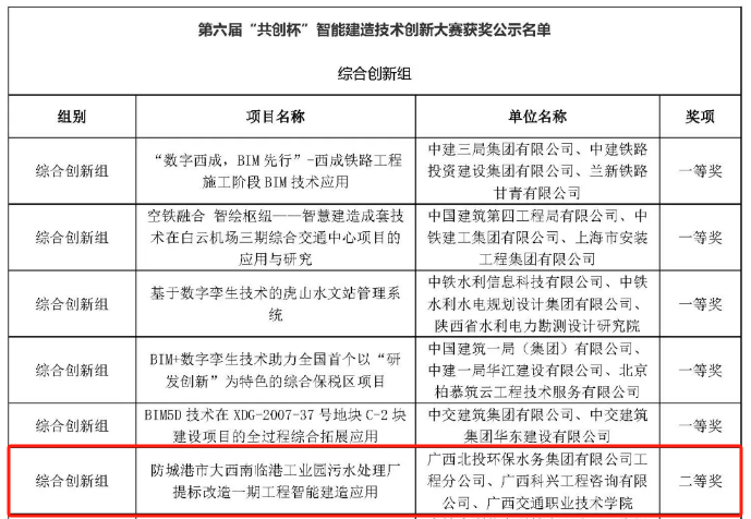 近日,中國技術(shù)創(chuàng)業(yè)協(xié)會技術(shù)創(chuàng)新工作委員會公布了第六屆“共創(chuàng)杯”智能建造技術(shù)創(chuàng)新大賽公示獲獎名單。環(huán)保水務(wù)集團(tuán)工程分公司的參賽作品《防城港市大西南臨港工業(yè)園污水處理廠提標(biāo)改造一期工程智能建造應(yīng)用》榮獲大賽綜合創(chuàng)新組二等獎。