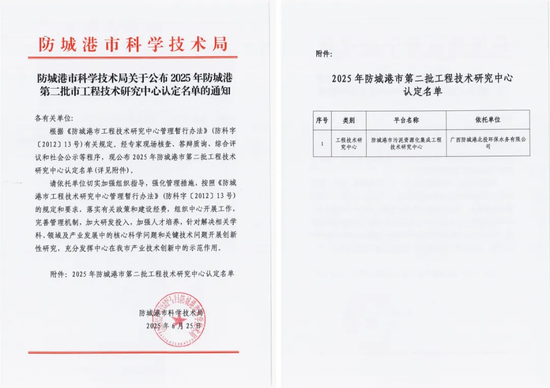 近日,防城港市科學(xué)技術(shù)局正式公布2025年第二批市工程技術(shù)研究中心認(rèn)定名單,由環(huán)保水務(wù)集團(tuán)牽頭建設(shè)的“防城港市污泥資源化集成工程技術(shù)研究中心”(以下簡稱“中心”)成功入選。